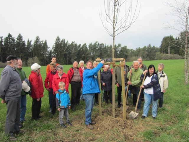 In der Regel pflanzt unsere Ortsgruppe immer den Baum des Jahres – 2016 wäre es die Winterlinde – . Dieses Jahr machten wir jedoch eine Ausnahme. Auf unserem Baumlehrpfad „Auf Wangen“ befindet sich bereits eine Winterlinde. Der diesjährige Baum wurde von Sylvia Jöns-Butschle anlässlich ihrer Silberhochzeit gespendet. Passend zu diesem Anlass hat Klaus Butschle einen Silberahorn-Baum gepflanzt. 25 Teilnehmer waren gekommen um den Baum zu begießen (!).