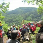 An unserer traditionellen Pfingstwanderung im Elsaß nahmen 29 Wanderer teil. Bei Sonnenschein, aber kühlen Temperaturen ging es mit dem Bus durch das Höllental hinab nach Freiburg und weiter über Colmar zu unserem Ausgangspunkt „Trois Epis“ (Drei Ähren) – ein bekannter Luftkurort in der Elsaß-Region „Haut-Rhin“ (Oberrhein) – , wo unsere elsässischen Wanderfreunde – 30 an der Zahl – mit dem Wanderführer Jean Dilmetz schon auf uns warteten. Es war eine herzliche Begrüssung. Unsere Partnerschaft mit dem Vogesenclub Selestat besteht nun schon seit 13 Jahren. Die Wanderung führte durch urige Bannwälder auf schmalen Pfaden, vorbei am Aussichts-punkt mit Blick auf Trois Epis und die Anhöhe „Galtz“ mit der imposanten Christus Statue, hinauf zum La Roche du Corbeau. Im Wanderheim des Vogesenclubs Turckheim machten wir Mittagspause mit Rucksackvesper. Nach der Wanderung besichtigte die Gruppe die Basilique Notre Dame in Trois Epis. Unsere elsässischen Wander-freunde mit ihrem Vorstand Jean-Claude Christen luden anschliessend zur Weinprobe nach Orschwiller ein. Auf der „Weinstrasse“ fuhren wir mit dem Bus durch die kleinen charismatischen Dörfchen mit ihren bunt bemalten Häusern vorbei an der stolzen Königsburg. Im Weinkeller „Les Faitieres“ war gute Stimmung angesagt. Unter den Akkordeonklängen von Franz Samson und Klaus Butschle wurde zum Wein und Gugelhupf viel gesungen und getanzt. Die Trossinger bedankten sich und luden ihre elsässischen Wanderfreunde zur „Trossinger Morgensupp“ nach Trossingen ein. Den Abend liessen die Wanderer in Buchenbach im Adler harmonisch ausklingen.