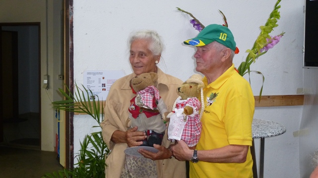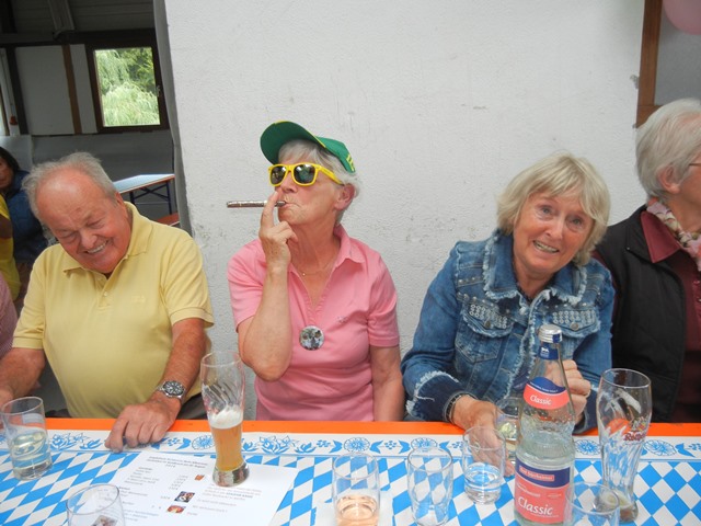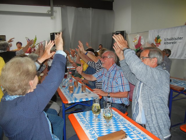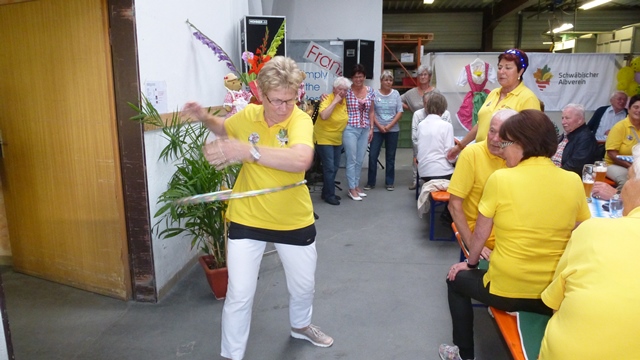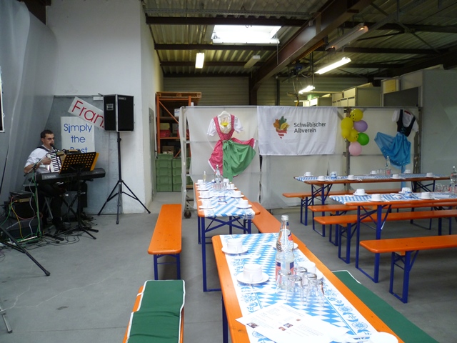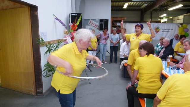Der Einladung zum Gartenfest anlässlich der Papierhochzeit von Albärtle + Albärtine im Sandbruch bei Bühlers folgten ca. 50 Albvereinler. Gefeiert wurde in der bayrisch geschmückten Werkshalle. Zum Empfang gab es ein Gläschen Sekt, gespendet von dem Hochzeitspaar. Unser bewährte Musikus Franz Samson umrahmte das Fest musikalisch.Ein besonderer Dank gilt der Familie Bühler, die ihre Location für uns zur Verfügung stellte. Ferner geht unser Dank an alle Helfer und Kuchenspender. Gefeiert wurde bis am späten Abend. Fünf Olypioniken stellten sich dem Hulahup-Wettbewerb, den Gisela Hofmann knapp gewonnen hatte. Es wurde viel getanzt, geschunkelt und Polonaissen rundeten das gelungene Fest ab.