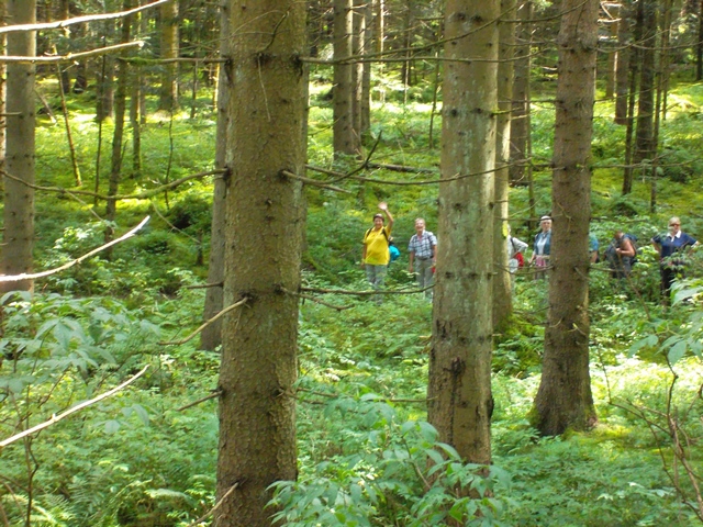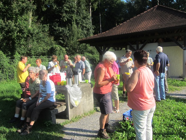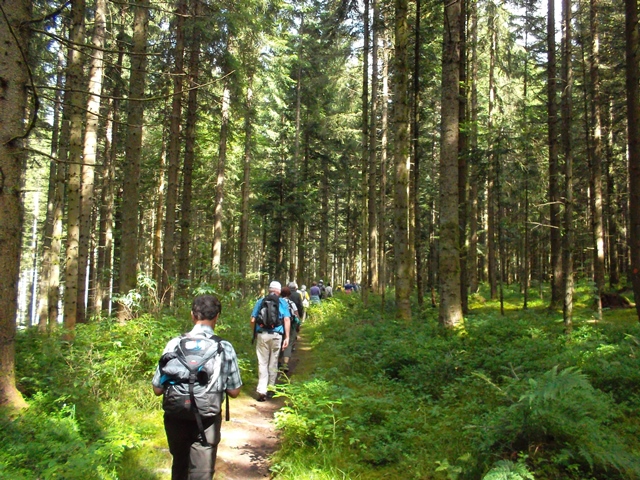 Warum in die Ferne schweifen, wenn das Schöne liegt so nah. Der Genießerpfad vor der Haustür Villingens macht seinem Namen alle Ehre. Genuß pur. Zu Beginn der Wanderung am Bahnhöfle Unterkirnach lud WF Wilfried die 26 Wanderer anlässlich seines 75. Geburtstages im Wald zur Trossinger Morgensupp ein. Gewandert wurde anschliessend auf weichen Waldböden, allerdings musste auf die Wurzeln geachtet werden. Heidelbeersträucher verleiten zum Naschen. Schattige Waldwege führen vorbei am 12 m hohen Uhufelsen. An der „Forelle“ liefen die Wanderer mit leichtem Anstieg hinauf zum Gasthaus Breitbrunnen. Dort machte die Gruppe Mittagspause. Danach führte der Weg weiter auf abwechslungsreichen Waldpassagen zum Wildgehege Salvest. Das letzte Stück gingen die Teilnehmer auf dem Schwarzwald-Jura-Bodensee Weg und Römerweg. Die tiefen Furchen im einstigen Handelsweg stammen aus dem Mittelalter. Der 12 km-lange Genießerpfad fand bei Allen großen Anklang.