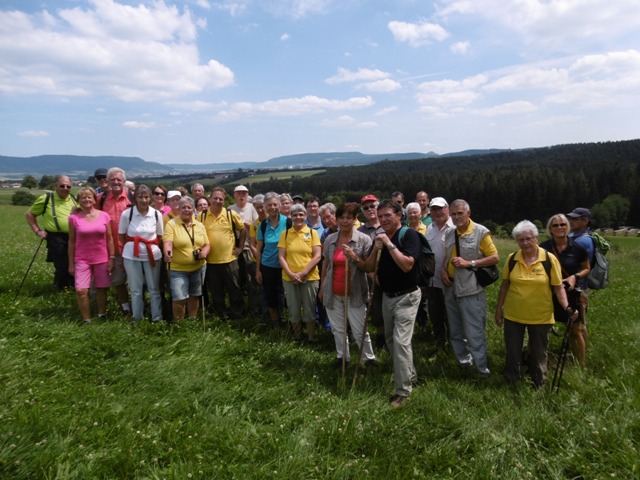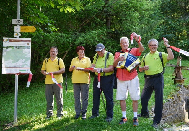 Eine große Schar von Albvereinlern und Wanderfreunden (55 Personen) konnte die Vorsitzende Anneliese Burgbacher zur Jubiläums-Genuss-Wanderung bei „Kaiserwetter“ am Naturfreundehaus begrüssen. Darunter auch den Ex-Wirtschaftsminister Ernst Pfister, der die Gruppe auch musikalisch mit seinem Akkordeon begleitete. Die Vorsitzende hatte auch eine Überraschung parat. Bei der Jubiläumswanderung wurde der neue Jubiläumspfad, die Hagenbachidylle, der die beiden Ortsgruppen Trossingen + Aixheim verbindet, mit der neuen Wandertafel eingeweiht. Nicht nur die Trossinger haben dieses Jahr ein Jubiläum. Auch die OG Aixheim. Aixheim feiert dieses Jahr ihr 50-jähriges Jubiläum. Zu diesem Anlass überreichte Anneliese Burgbacher dem Obmann v. Aixheim Elmar Efinger ein Bild von der Trossinger Volkstanzgruppe, die bei der Vereinsgründung 1968 mitgewirkt hat.