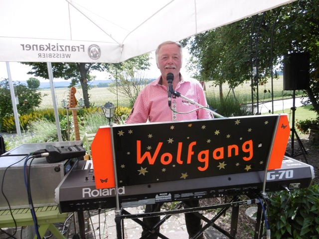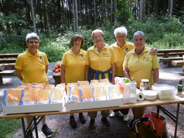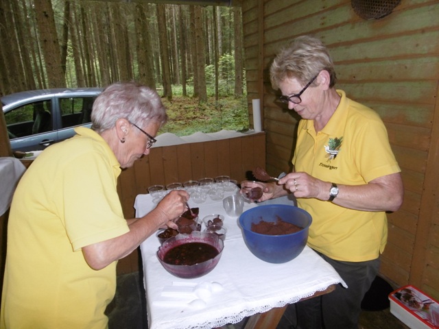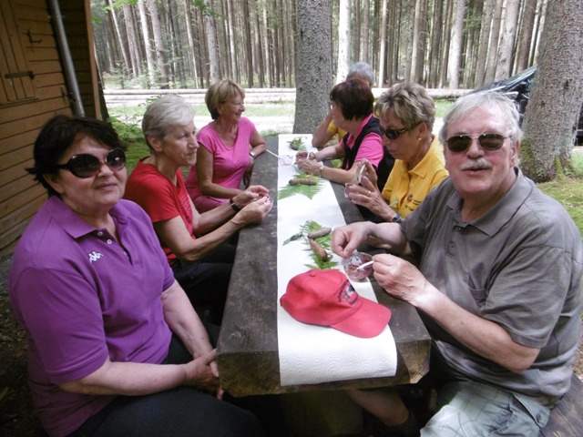 Der Weg führte nun weiter auf dem romantischen Naturpfad nach Aixheim mit Einkehr im Sportheim. Dort wartete Gegrilltes mit Salat auf die Teilnehmer. Musikalisch wurde die Gruppe vom Alleinunterhalter Wolfgang unterhalten. Von Lolita-Liedern bis hin zum Rock‘n Roll. Ein paar Abkürzer nahmen das Angebot vom „Wander-Taxi“ gerne in Anspruch. Gestärkt ging es weiter zur Aixheimer Hessenhardthütte, wo die nächste Überraschung auf die Wanderer wartete. Inge Kiess + Ingrid Heizmann servierten die Nachspeise „Mousse au chololate mit Waldbeeren auf schön gedeckten Tischen.
