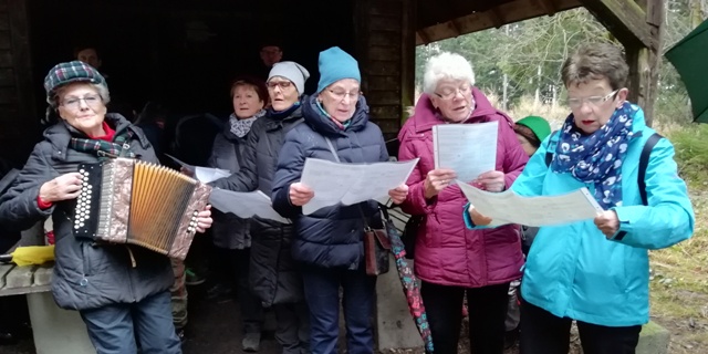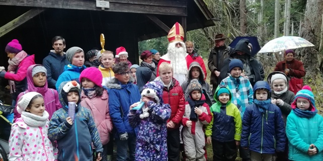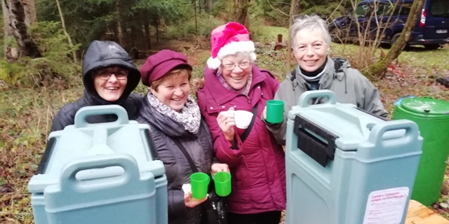 Seit über 40 Jahren ist es eine liebgewonnene Tradition der OG Trossingen geworden, am 3. Advent zur Waldweihnacht an die Pfarrwaldhütte in den Lauberhardt zu wandern. 1980 und 1983 kamen dann die Ortsgruppen Aldingen und Spaichingen hinzu. Der leichte Nieselregen konnte jedoch der fröhlichen Kinderschar nichts anhaben. Sie warteten gespannt auf das Erscheinen vom Nikolaus und Knecht Ruprecht. Vor der Bescherung durch den Nikolaus wurden unter der musikalischen Begleitung von Helga Birk gemeinsam ein paar Weihnachtslieder am Lagerfeuer gesungen. Im Anschluss daran gab es für alle Glühwein, Punsch und selbstgebackene Weihnachtsbrötle.
