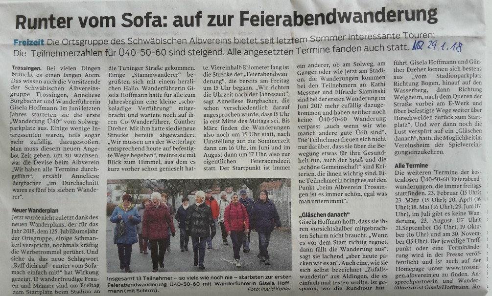 Zur ersten Feierabendwanderung Ü 40-50-60 am 26. Janaur nahmen erfreulicherweise 15 Personen teil. Der Slogan : raff Dich auf – runter vom Sofa – hat gefruchtet….! Gewandert wurde über den Bogen, am Kieswerk … Weiterlesen