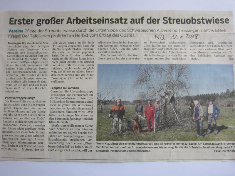 Unsere Ortsgruppe hat die Patenschaft für die Pflege der Streuobstwiese mit 64 Obstbäumen, vom Pächter Multus übernommen. Zuvor war die Streuobstwiese seit vielen Jahren an die Stadt Trossingen verpachtet … Weiterlesen